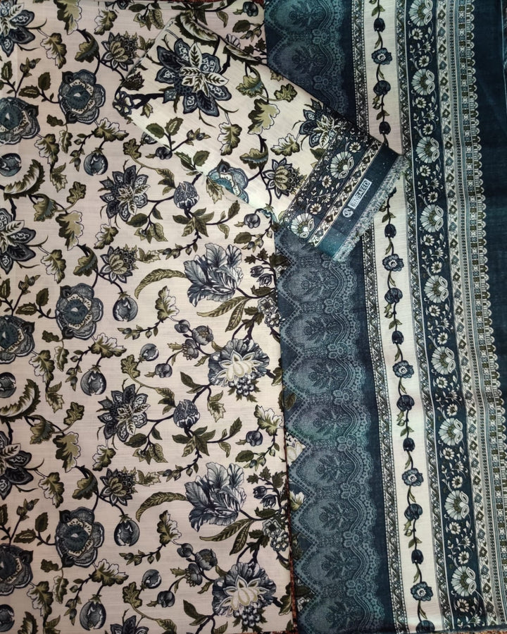 Elevate your summer wardrobe with this graceful cream & navy blue floral printed lawn suit. Adorned with intricate floral vines, elegant borders, and a soft feel, this suit blends comfort and style for every occasion.