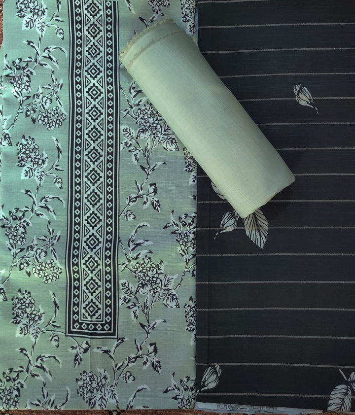 Bring freshness and elegance into your daily wear with this beautiful 3-piece unstitched lawn suit. The cool mint green floral shirt with a classic printed neck panel pairs effortlessly with a printed black striped leaf dupatta and a soft dyed trouser, creating a graceful high-contrast look ideal for summer.