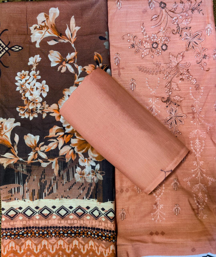 Style meets warmth in this beautifully crafted 3-piece khaddar suit, ideal for the chilly season. The elegant rust-orange shirt is delicately embroidered with floral motifs, while the rich printed dupatta in deep brown and orange floral tones adds bold charm. A plain dyed trouser completes the look for easy stitching and styling.
